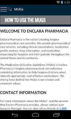Exclusively designed for Enclara Pharmacia clients, the Medication Utilization Guidelines (MUGs) app is a comprehensive clinical support tool for hospice clinicians. The app provides ready access to resources for selecting clinically appropriate, cost effective medications based upon the patient's symptoms and/or underlying conditions. Users also have the ability to access the MUGs without an internet connection.