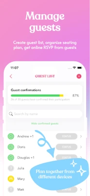Guest list. Import guests from your contacts and manage their RSVP’s. Wedding planning is easier when you have a convenient guest list, isn’t it?